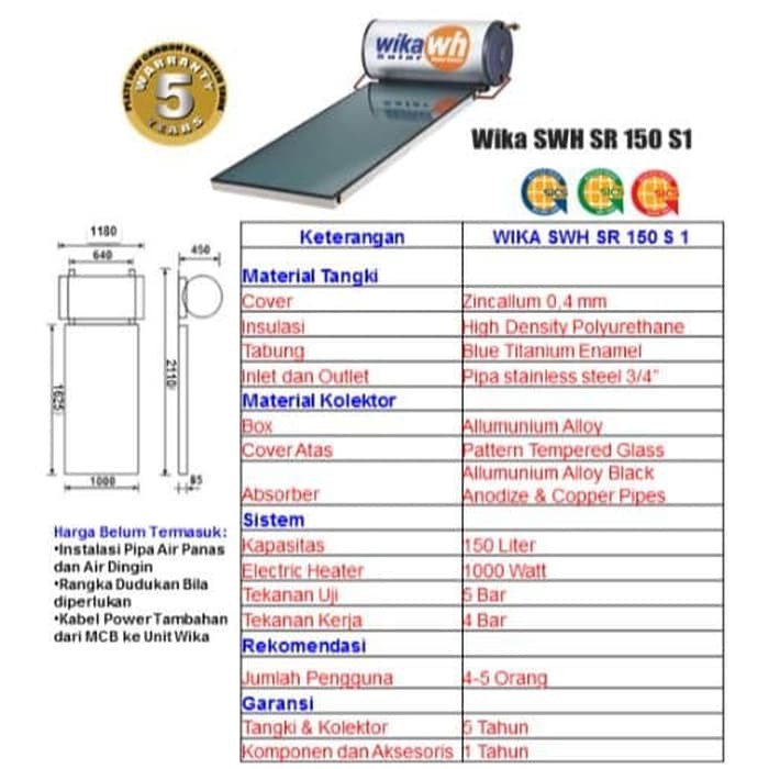Wika solar water heater passive system. Selain dealer wika water heater kami juga dealer resmi pipa ppr toro 25 made in italy, dengan pilihan pipa pn 10, pn 16, dan pn 20. Daftar harga water heater atau pemanas air wika yang akan kami sampaikan disini ada 3 type yaitu solar heat passive yang terdiri dari produk standar kapasitas 130liter, 150liter dan 300liter, type aktive dengan kapasitas standart antara 1000liter s/d 4000liter untuk keperluan apartement, industri, hotel. Beli water heater wika online berkualitas dengan harga murah terbaru 2021 di tokopedia! Produk pemanas air tenaga surya untuk memenuhi kebutuhan air hangat rumah tangga, kos, hotel, rumah sakit, salon. Untuk solusi kebutuhan air panas hemat energi, sehat, dan juga. Panel kolektor harus diletakan pada suatu tempat yang mana sinar matahari bisa menyinari tanpa terhalang oleh obyek apapun sepanjang tahun. Cara memasang water heater sendiri. Non cfc high density injection polyurethane tabung. Kami menyediakan berbagai produk pemanas air tenaga surya (solar water heater) dari wika. Galvalume 0,3 mm coating clear insulasi : Berikut kualitas yang sangat baik dari. Daftar harga pemanas air wika water heater.